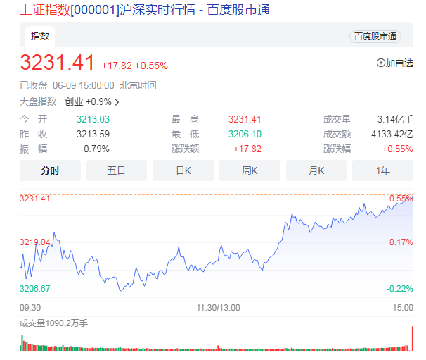 截至收盘,沪指涨0.55%报3231.41点,深成指涨0.66%报10793.93点,创业板指涨0.9%报2143.01点,科创50指数大涨2.53%;两市合计成交9896亿元,北向资金净卖出14.41亿元。
