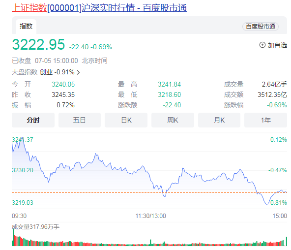 截至收盘,沪指跌0.69%报3222.95点,深成指跌0.91%报11029.3点,创业板指跌0.91%报2212.42点,科创50指数跌0.95%;两市合计成交8678亿元,北向资金净卖出40.35亿元。