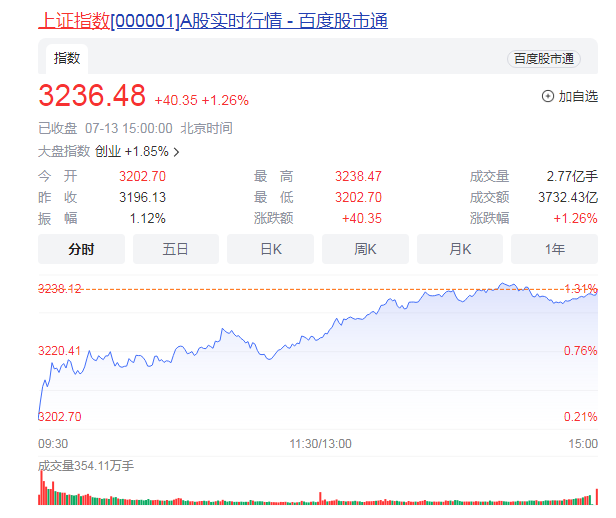 7月13日,两市股指盘中强势单边上扬,沪指涨超1%站稳3200点,创业板指涨近2%;两市成交额明显放大,重返9000亿元上方;北向资金净买入超130亿元。