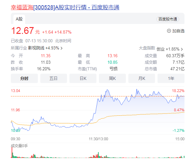 传媒板块13日盘中大幅走高,影视股表现亮眼,截至发稿,幸福蓝海大涨超15%,奥飞娱乐涨停,芒果超煤涨超7%,中国电影、慈文传媒、上海电影、华谊兄弟、万达电影等涨超5%。此外,中国出版亦涨停,中视传媒、中国科传涨近8%。