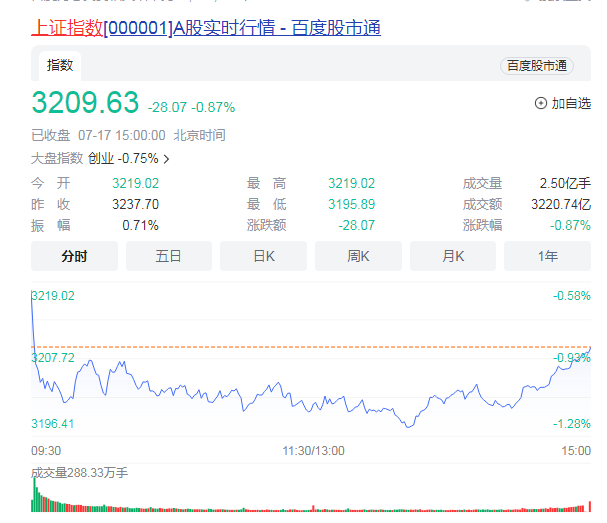 7月17日,两市主要股指低开低走,盘中弱势下探,尾盘跌幅略有收窄,沪指坚守3200点;两市成交额缩至8000亿元左右。