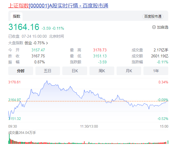 7月24日消息 周一A股三大指数集体低开,早盘市场反弹冲高回落,三大指数盘中曾集体翻红,单午前仅剩沪指微幅收涨;午后开盘A股进一步回落,尾盘陷入横盘整理态势,三大指数集体收跌。