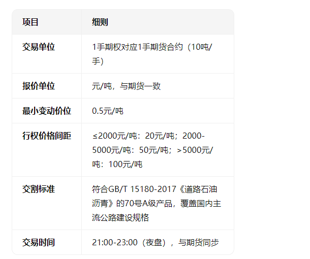 石油沥青期权以10吨/手的期货合约为标的,采用美式行权方式,买方可在到期日前任一交易日提交行权申请。核心规则如下: