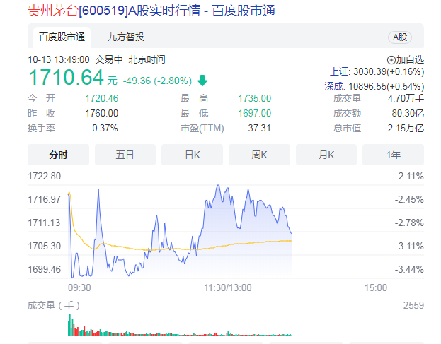 酒类股13日盘中走势现明显分化,截至发稿,贵州茅台跌超3%,盘中跌破1700元整数关口;五粮液、山西汾酒等均走低;水井坊涨超5%,舍得酒业涨超2%,老白干酒涨超1%。