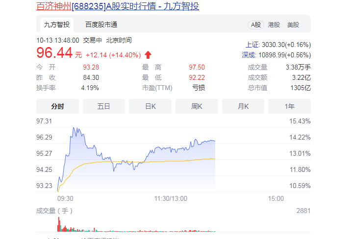 CXO概念13日盘中大幅走高,截至发稿,百济神州大涨近13%,百花医药涨停,药石科技涨约9%,阳光诺和涨超8%,药明康德涨约7%;港股方面,百济神州涨超13%,盘中一度大涨超20%;药明康德涨近5%。