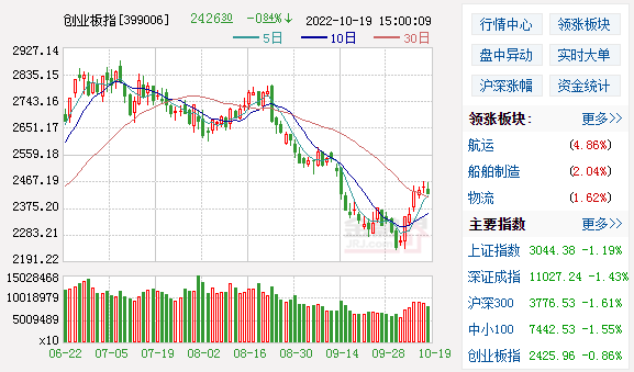 10月19日消息 周三A股低开,早盘沪指、深成指震荡走弱,创业板则冲高回落再度翻绿;午后三大指数跌幅扩大,沪指、深成指跌超1%,创业板指止步六连阳。