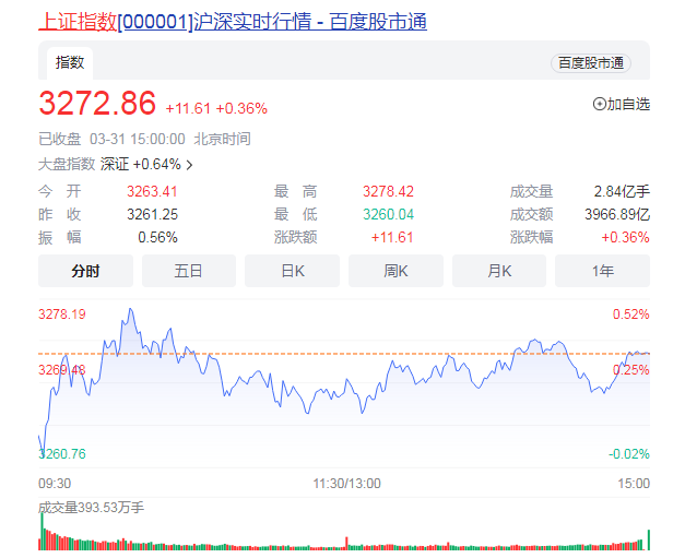 截至收盘,沪指涨0.36%报3272.86点,深成指涨0.64%报11726.4点,创业板指涨0.69%报2399.5点,科创50指数涨1.49%;两市合计成交9533亿元,北向资金净买入16.74亿元。