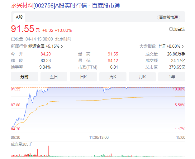 锂电池概念14日盘中发力走高,截至发稿,永兴材料涨停,天华新能、中矿资源涨超8%,赣锋锂业涨超7%,德方纳米、久吾高科、天齐锂业等涨超6%。