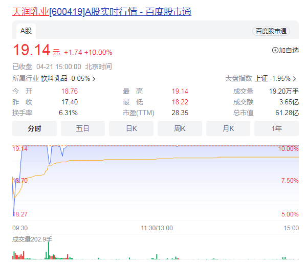 食品饮料股21日盘中再度走强,乳业股表现亮眼。截至发稿,天润乳业涨停,麦趣尔涨超6%,熊猫乳品涨近5%,庄园牧场、西部牧业等上扬。此外,南宁糖业涨超6%,益客食品涨近5%,中粮糖业涨近4%。