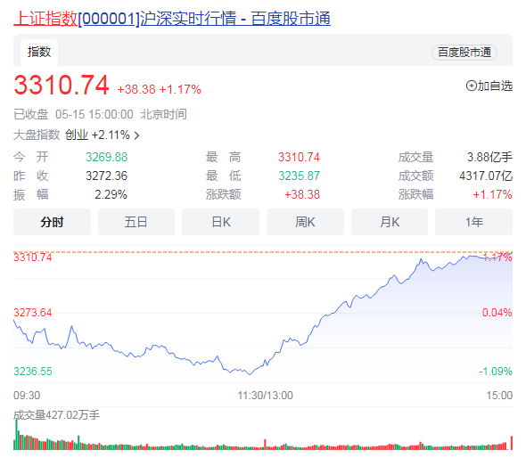 5月15日,沪指低开低走,早盘一度跌超1%,午后在金融板块的带动下快速反弹收复3300点;创业板指强势上扬涨超2%;两市成交额有所放大,全日成交近9400亿元,北向资金净买入超40亿元。