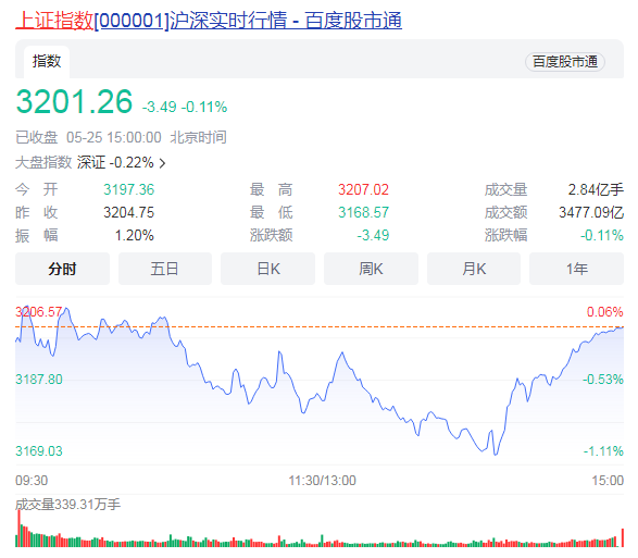 5月25日,两市股指盘中探底回升,沪指险守3200点,创业板指接近翻红,科创50指数尾盘拉升涨近1%;两市成交额有所放大,北向资金净卖出近100亿元。