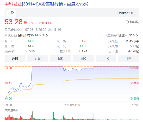 稀土板块5日盘中强势拉升,截至发稿,中科磁业“20cm”涨停,银河磁体涨超13%,创兴资源亦涨停,大地熊涨超9%,中国稀土、龙磁科技涨约7%,正海磁材、金力永磁、广晟有色、北方稀土等涨约5%。