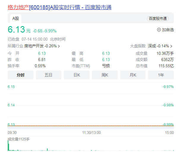 近日7连板的大连热电跳水走低 格力地产一字跌停